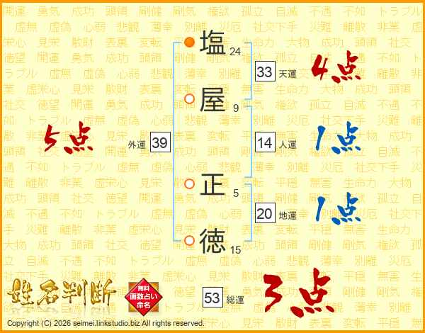 塩(24画)屋(9画) 正(5画)徳(15画)