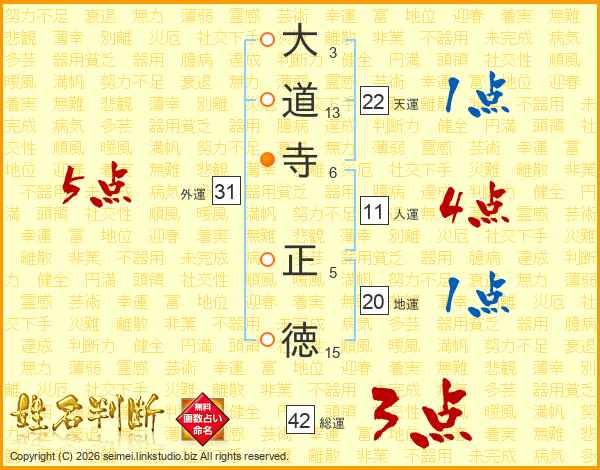 大(3画)道(13画)寺(6画) 正(5画)徳(15画)