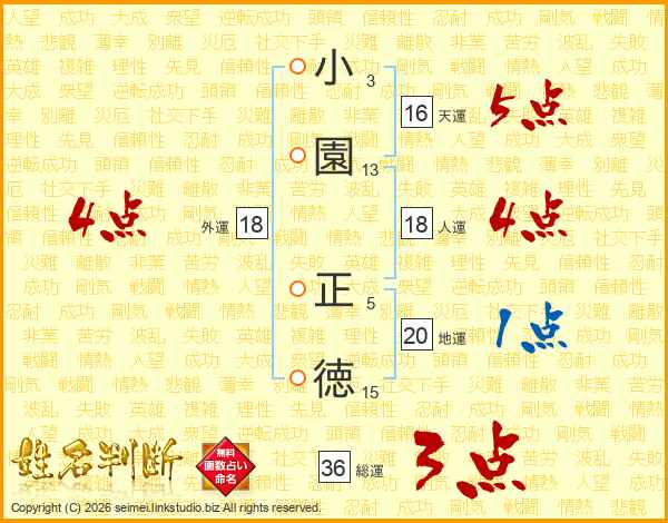 生活面を象徴する運勢です。外部から受ける影響力を表し、結婚運、家庭運や職場、環境への順応性を表します。総運から人運を引いた画数。姓や名が1文字の場合を除く。