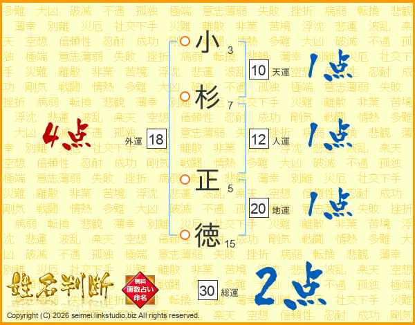 あなたの人生を表す1番重要な運勢です。生涯を通じて影響する総合運となり、主に50歳以降の晩年期に影響を及ぼします。苗字と名前の合計画数。