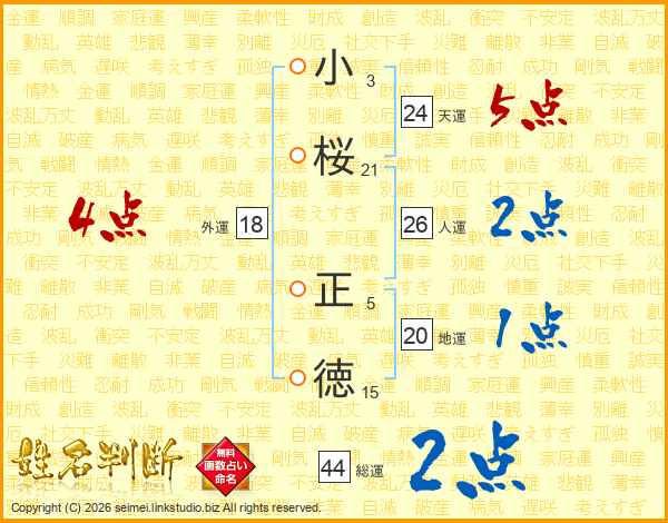 生活面を象徴する運勢です。外部から受ける影響力を表し、結婚運、家庭運や職場、環境への順応性を表します。総運から人運を引いた画数。姓や名が1文字の場合を除く。