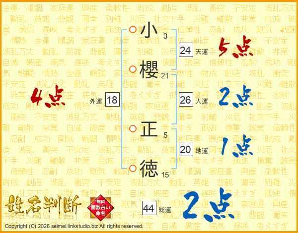 小(3画)櫻(21画) 正(5画)徳(15画)
