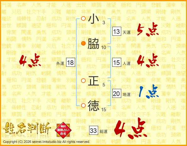 生活面を象徴する運勢です。外部から受ける影響力を表し、結婚運、家庭運や職場、環境への順応性を表します。総運から人運を引いた画数。姓や名が1文字の場合を除く。