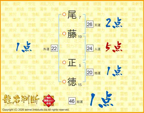 尾(7画)藤(19画) 正(5画)徳(15画)