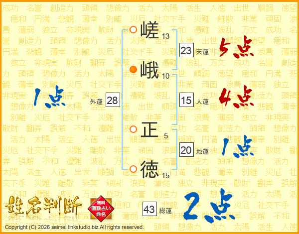 嵯(13画)峨(10画) 正(5画)徳(15画)