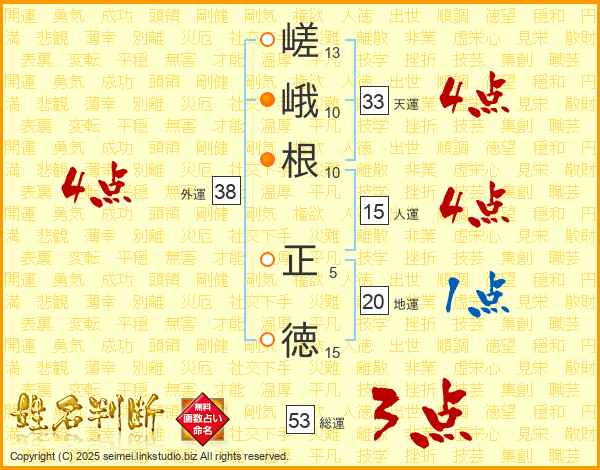 嵯(13画)峨(10画)根(10画) 正(5画)徳(15画)