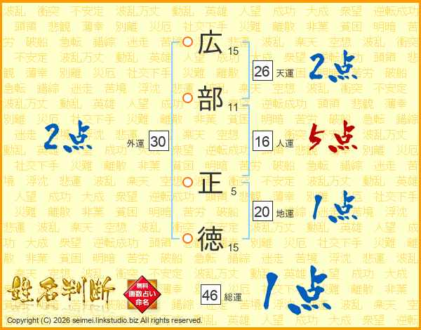 生活面を象徴する運勢です。外部から受ける影響力を表し、結婚運、家庭運や職場、環境への順応性を表します。総運から人運を引いた画数。姓や名が1文字の場合を除く。