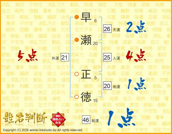 早(6画)瀬(20画) 正(5画)徳(15画)