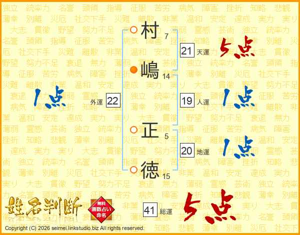 村(7画)嶋(14画) 正(5画)徳(15画)