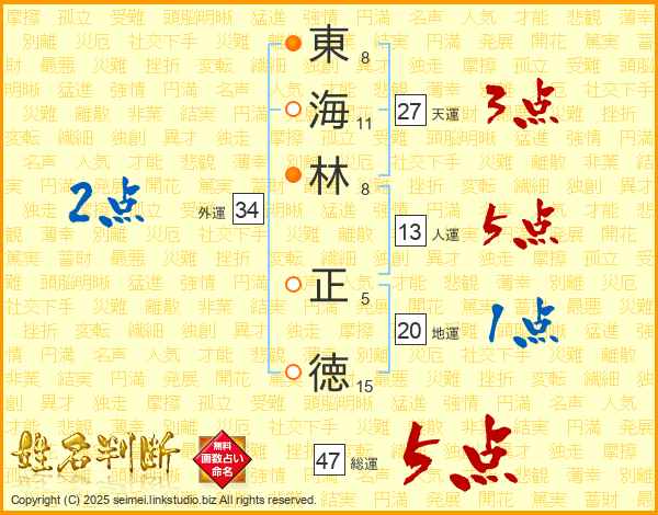 東(8画)海(11画)林(8画) 正(5画)徳(15画)