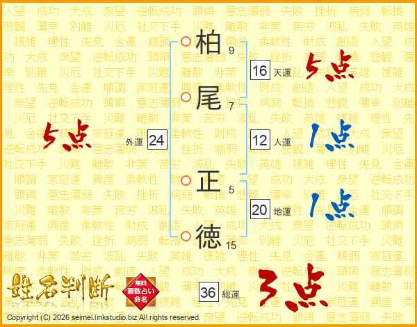 柏(9画)尾(7画) 正(5画)徳(15画)