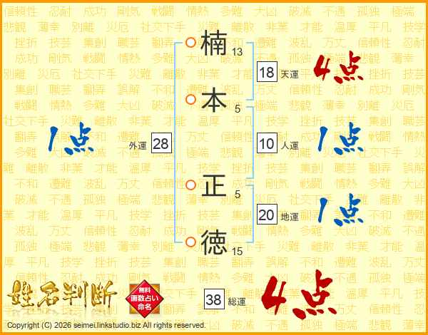 楠(13画)本(5画) 正(5画)徳(15画)