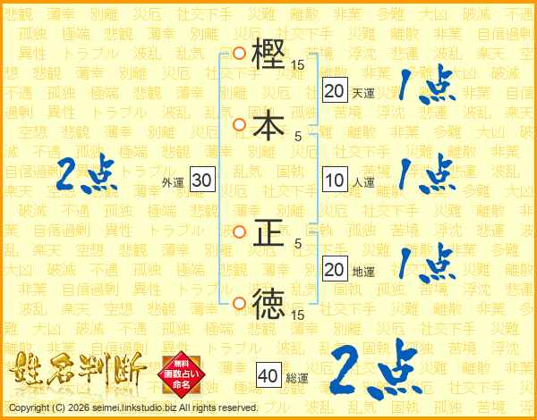 樫(15画)本(5画) 正(5画)徳(15画)