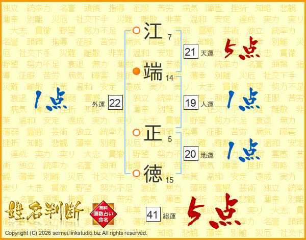 生活面を象徴する運勢です。外部から受ける影響力を表し、結婚運、家庭運や職場、環境への順応性を表します。総運から人運を引いた画数。姓や名が1文字の場合を除く。