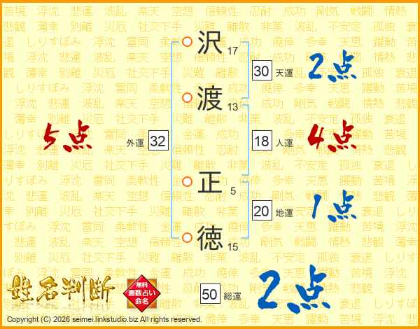 沢(17画)渡(13画) 正(5画)徳(15画)