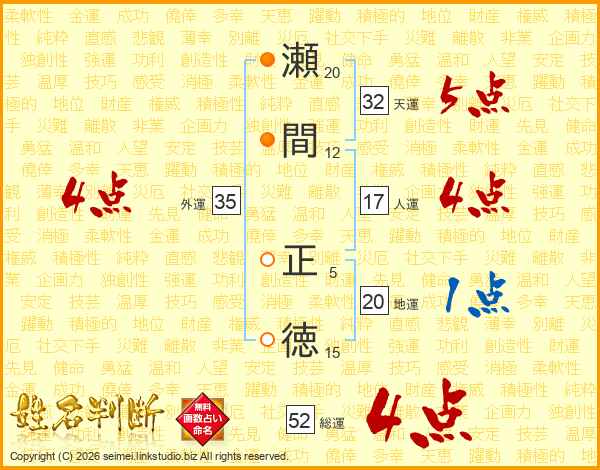 瀬(20画)間(12画) 正(5画)徳(15画)