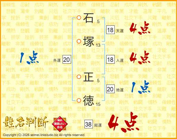 生活面を象徴する運勢です。外部から受ける影響力を表し、結婚運、家庭運や職場、環境への順応性を表します。総運から人運を引いた画数。姓や名が1文字の場合を除く。