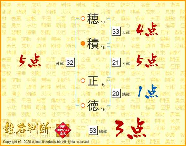 生活面を象徴する運勢です。外部から受ける影響力を表し、結婚運、家庭運や職場、環境への順応性を表します。総運から人運を引いた画数。姓や名が1文字の場合を除く。