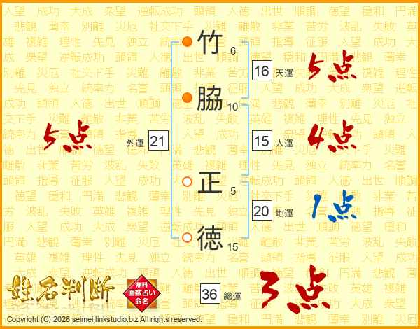 竹(6画)脇(10画) 正(5画)徳(15画)