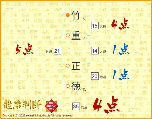 生活面を象徴する運勢です。外部から受ける影響力を表し、結婚運、家庭運や職場、環境への順応性を表します。総運から人運を引いた画数。姓や名が1文字の場合を除く。