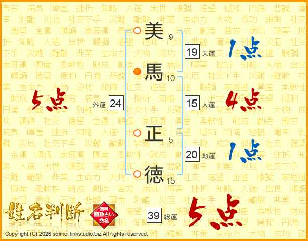 美(9画)馬(10画) 正(5画)徳(15画)