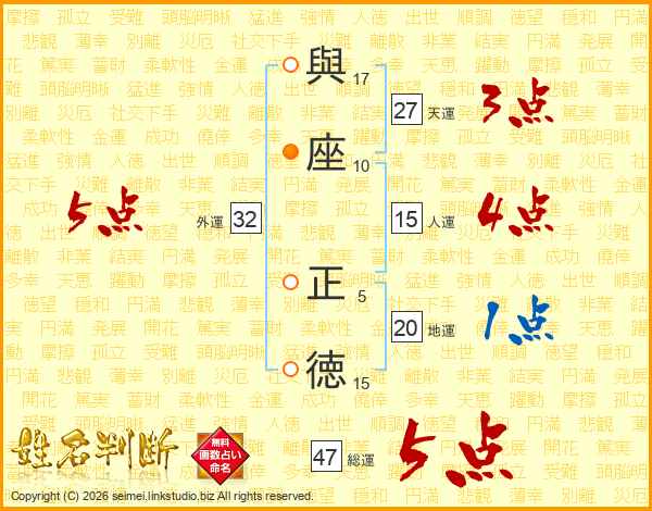 生活面を象徴する運勢です。外部から受ける影響力を表し、結婚運、家庭運や職場、環境への順応性を表します。総運から人運を引いた画数。姓や名が1文字の場合を除く。
