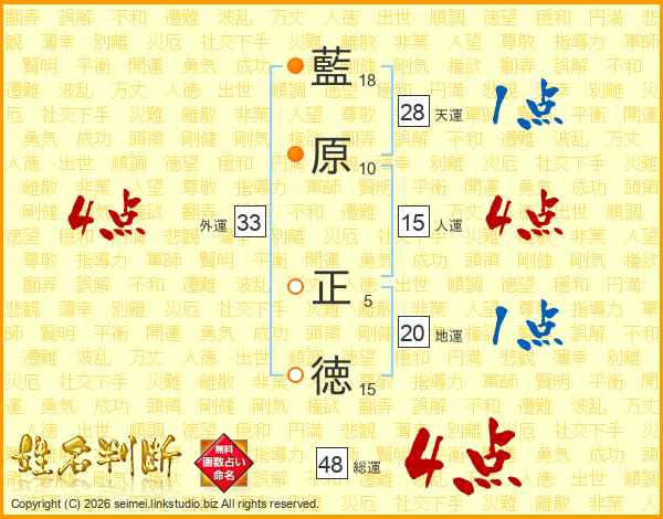 生活面を象徴する運勢です。外部から受ける影響力を表し、結婚運、家庭運や職場、環境への順応性を表します。総運から人運を引いた画数。姓や名が1文字の場合を除く。