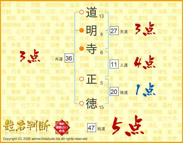 道(13画)明(8画)寺(6画) 正(5画)徳(15画)