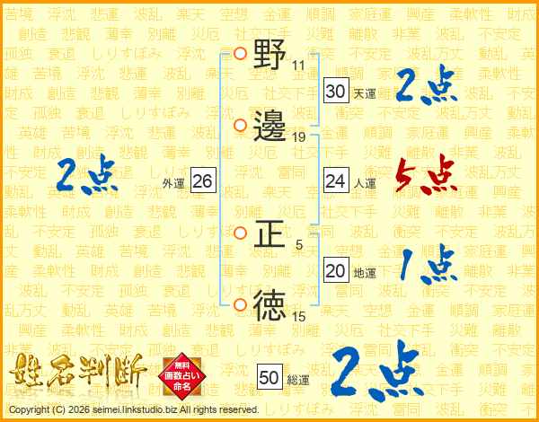 生活面を象徴する運勢です。外部から受ける影響力を表し、結婚運、家庭運や職場、環境への順応性を表します。総運から人運を引いた画数。姓や名が1文字の場合を除く。