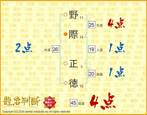 生活面を象徴する運勢です。外部から受ける影響力を表し、結婚運、家庭運や職場、環境への順応性を表します。総運から人運を引いた画数。姓や名が1文字の場合を除く。