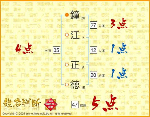 鐘(20画)江(7画) 正(5画)徳(15画)