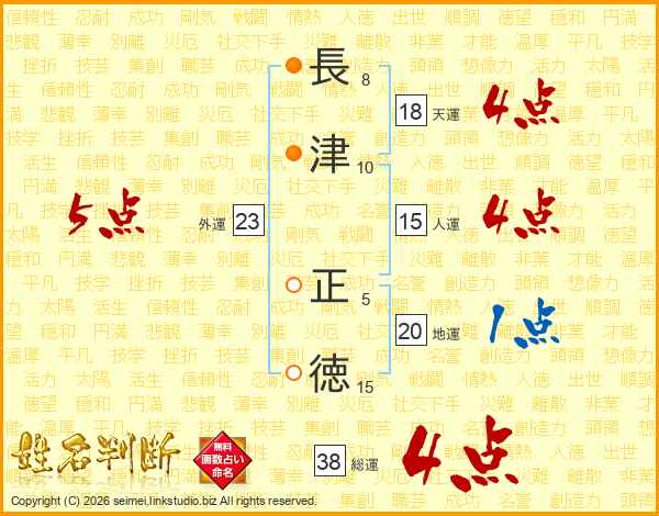 あなたの人生を表す1番重要な運勢です。生涯を通じて影響する総合運となり、主に50歳以降の晩年期に影響を及ぼします。苗字と名前の合計画数。