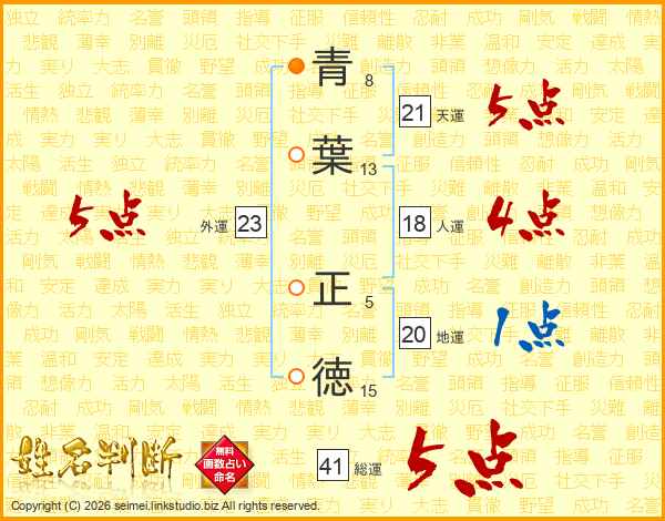 あなたの人生を表す1番重要な運勢です。生涯を通じて影響する総合運となり、主に50歳以降の晩年期に影響を及ぼします。苗字と名前の合計画数。