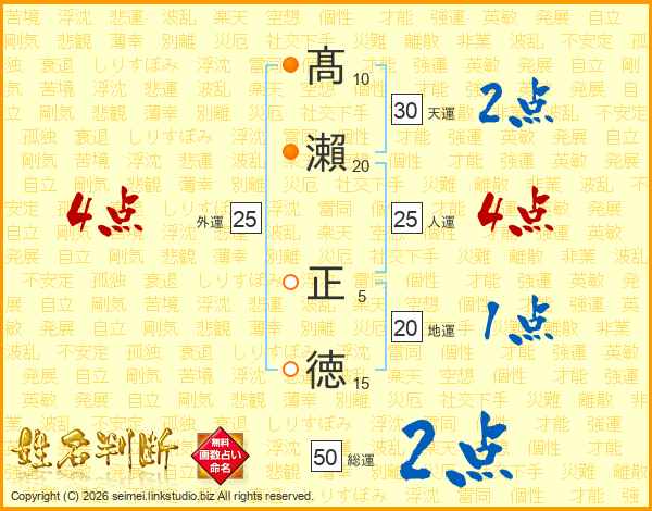 髙(10画)瀨(20画) 正(5画)徳(15画)