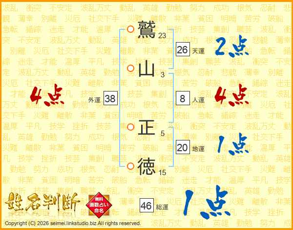 鷲(23画)山(3画) 正(5画)徳(15画)