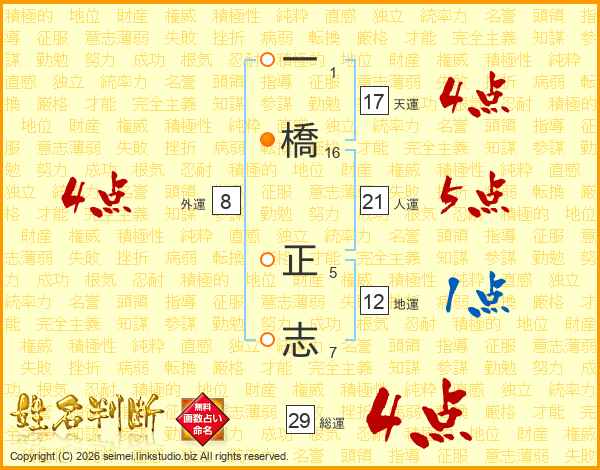 あなたの人生を表す1番重要な運勢です。生涯を通じて影響する総合運となり、主に50歳以降の晩年期に影響を及ぼします。苗字と名前の合計画数。