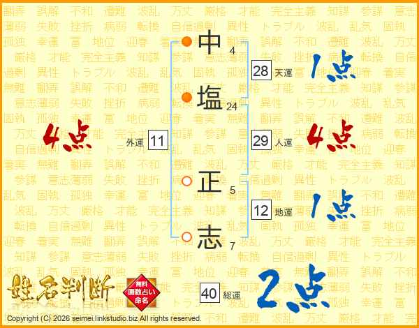 あなたの人生を表す1番重要な運勢です。生涯を通じて影響する総合運となり、主に50歳以降の晩年期に影響を及ぼします。苗字と名前の合計画数。