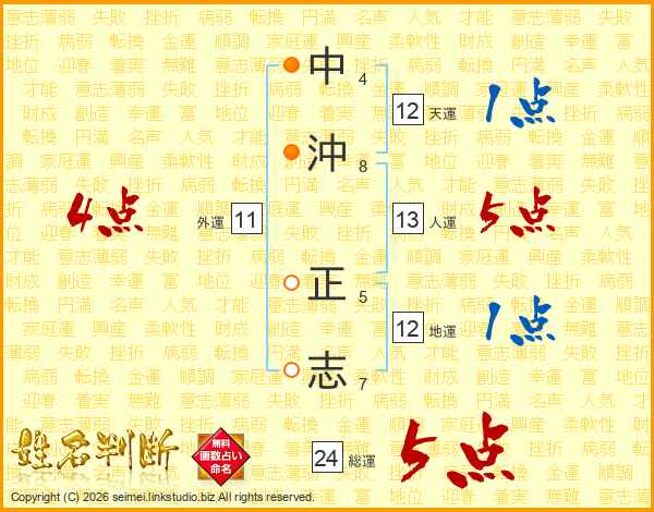 あなたの人生を表す1番重要な運勢です。生涯を通じて影響する総合運となり、主に50歳以降の晩年期に影響を及ぼします。苗字と名前の合計画数。