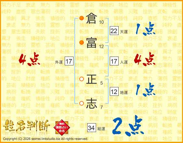 倉(10画)富(12画) 正(5画)志(7画)