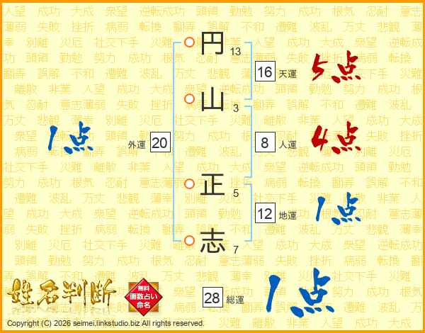 あなたの人生を表す1番重要な運勢です。生涯を通じて影響する総合運となり、主に50歳以降の晩年期に影響を及ぼします。苗字と名前の合計画数。