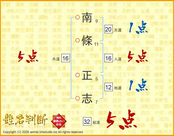 あなたの人生を表す1番重要な運勢です。生涯を通じて影響する総合運となり、主に50歳以降の晩年期に影響を及ぼします。苗字と名前の合計画数。