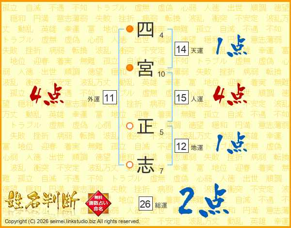 生活面を象徴する運勢です。外部から受ける影響力を表し、結婚運、家庭運や職場、環境への順応性を表します。総運から人運を引いた画数。姓や名が1文字の場合を除く。