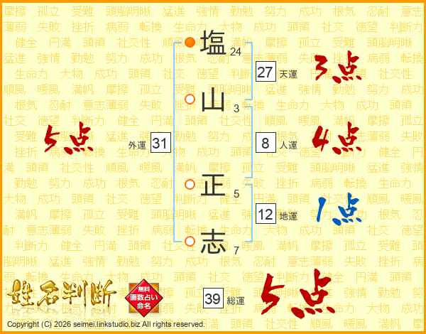 あなたの人生を表す1番重要な運勢です。生涯を通じて影響する総合運となり、主に50歳以降の晩年期に影響を及ぼします。苗字と名前の合計画数。