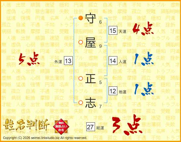守(6画)屋(9画) 正(5画)志(7画)