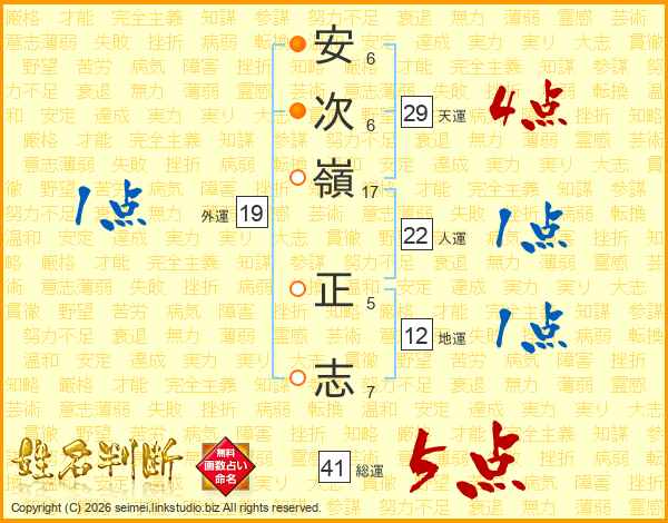 安(6画)次(6画)嶺(17画) 正(5画)志(7画)