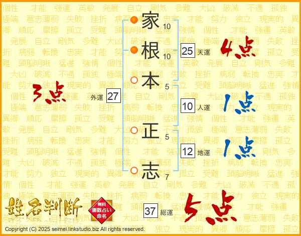家(10画)根(10画)本(5画) 正(5画)志(7画)