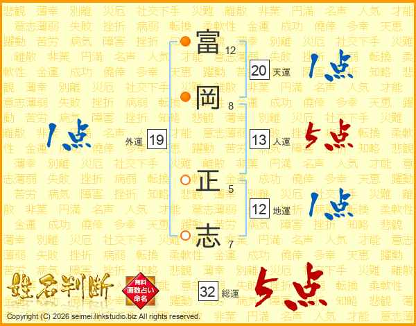あなたの人生を表す1番重要な運勢です。生涯を通じて影響する総合運となり、主に50歳以降の晩年期に影響を及ぼします。苗字と名前の合計画数。