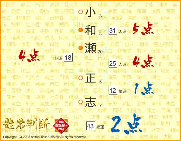 小(3画)和(8画)瀬(20画) 正(5画)志(7画)