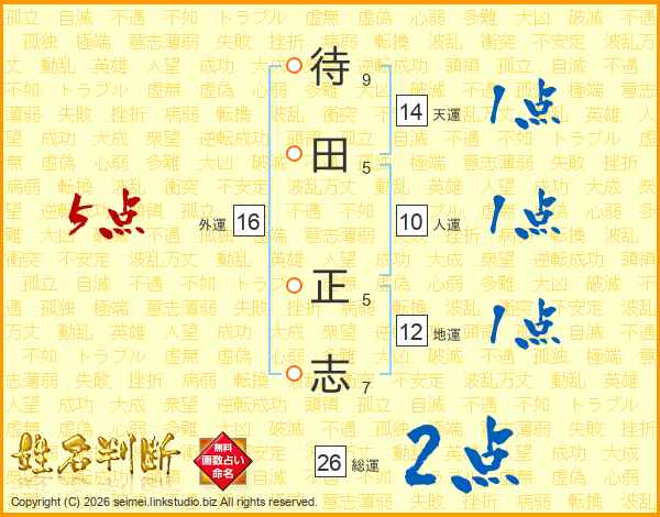 生活面を象徴する運勢です。外部から受ける影響力を表し、結婚運、家庭運や職場、環境への順応性を表します。総運から人運を引いた画数。姓や名が1文字の場合を除く。