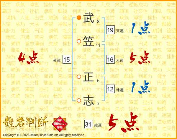 あなたの人生を表す1番重要な運勢です。生涯を通じて影響する総合運となり、主に50歳以降の晩年期に影響を及ぼします。苗字と名前の合計画数。